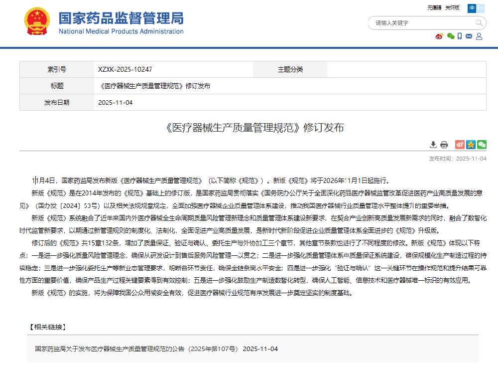 11月4日,国家药监局发布新版《医疗器械生产质量管理规范》(以下简称《规范》)。新版《规范》将于2026年11月1日起施行。