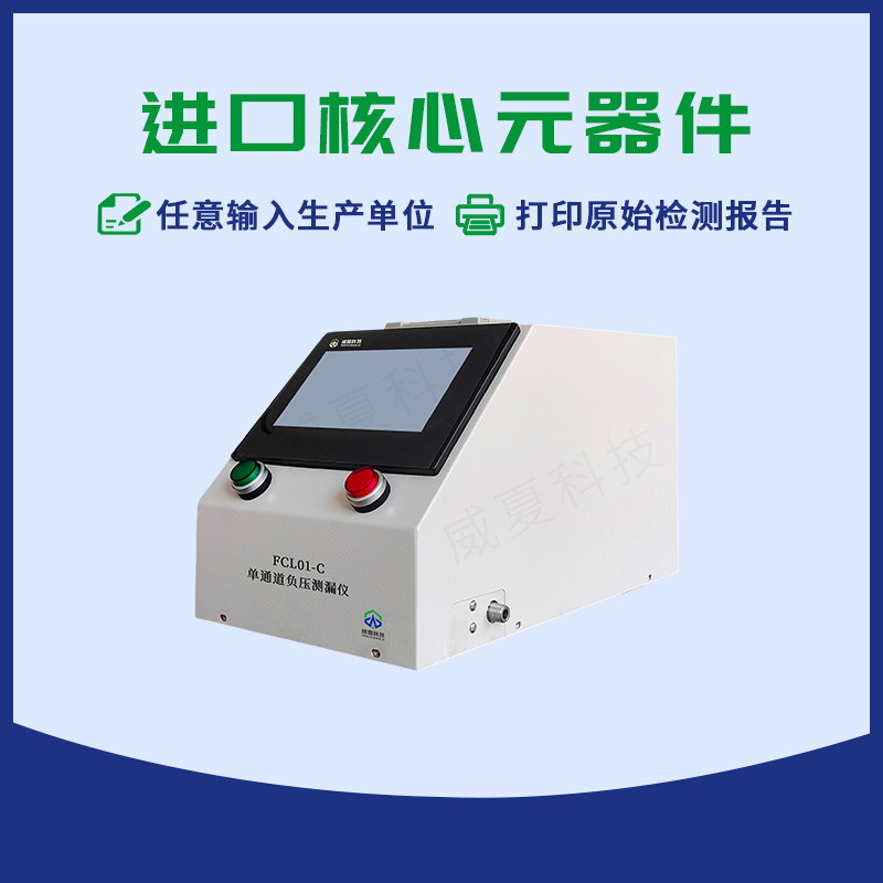 FCL01-C单通道负压测漏仪是威夏科技根据相关的国际标准、国家标准、行业标准及企业定制标准精心研发设计,适用于适用于输液器、输血器、输液针、麻醉包过滤器、管路、导管、快速接头等各类产品测试。