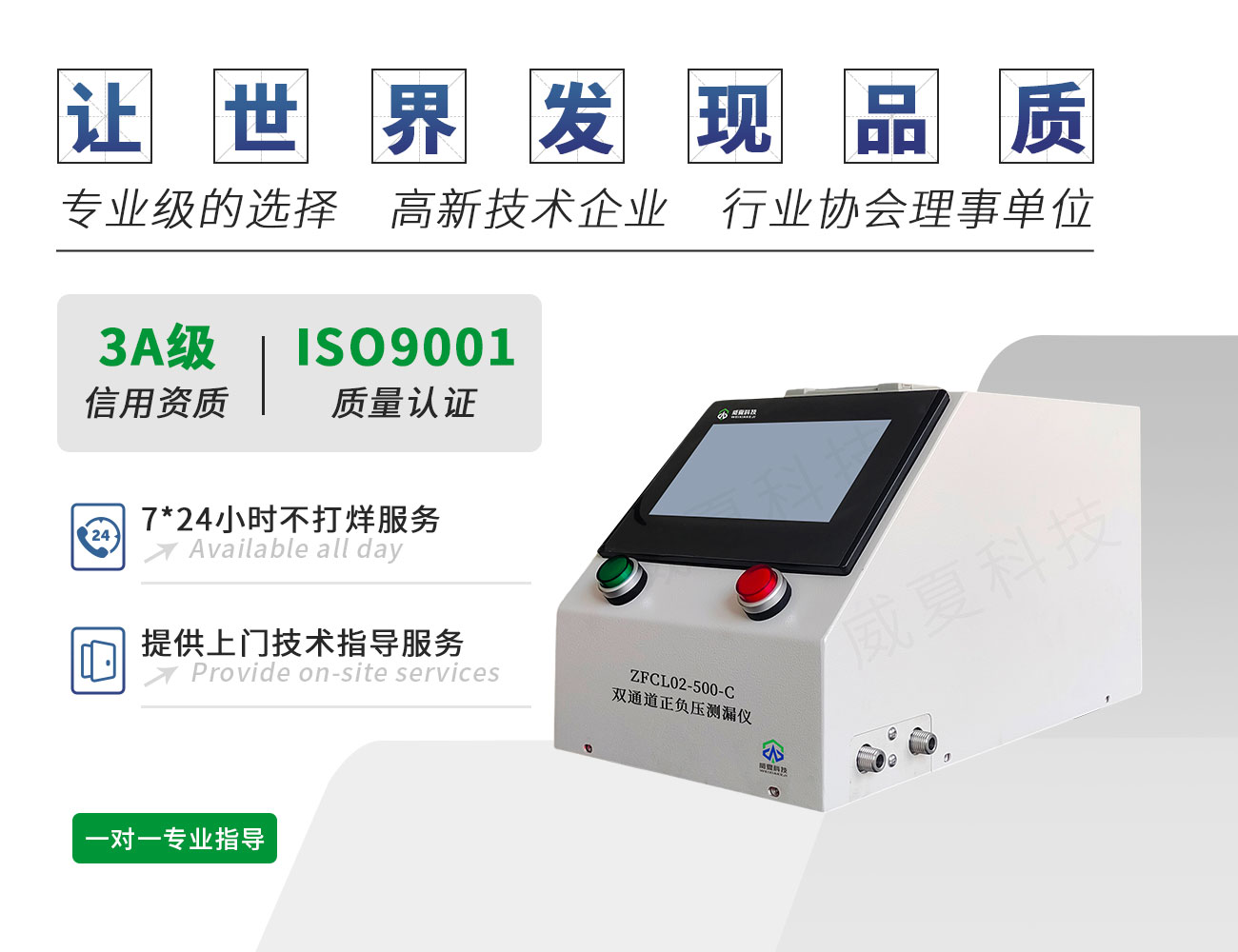 ZFCL02-500-C双通道正负压测漏仪是威夏科技根据相关的国际标准、国家标准、行业标准、团体标准及企业标准精心研发设计,适用于适用于输液器、输血器、输液针、麻醉包过滤器、管路、导管、快速接头等产品测试。